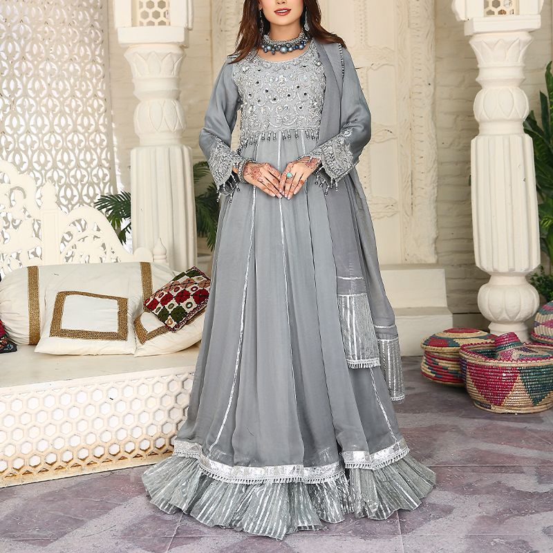 3 Piece Fancy Embroidery Dress - Stylish Light Weight Chiffon Fabric Suit Fancy Embroidered Dress For Events Party Outdoor Dress - Gray - Grey / Small is backordered and will ship as soon as it is back in stock.