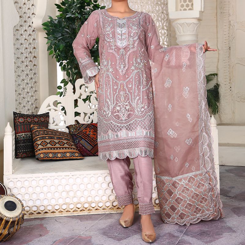 3 Piece Fancy Embroidery Dress - Stylish Light Weight Chiffon Organza Fabric Suit Fancy Embroidered Dress For Events Party Outdoor Dress - Dark Pink