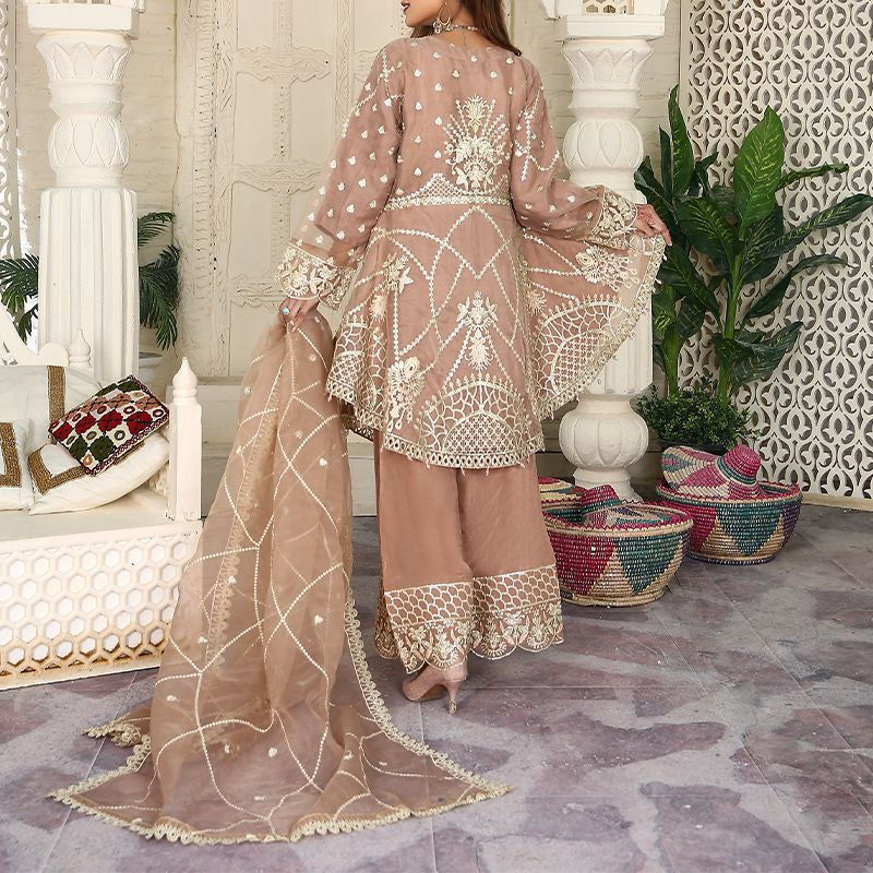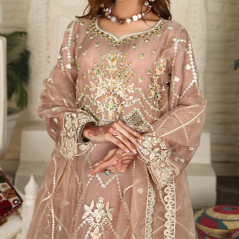 3 Piece Fancy Embroidery Dress - Stylish Light Weight Chiffon Organza Fabric Suit Fancy Embroidered Dress For Events Party Outdoor Dress - Dark Pink