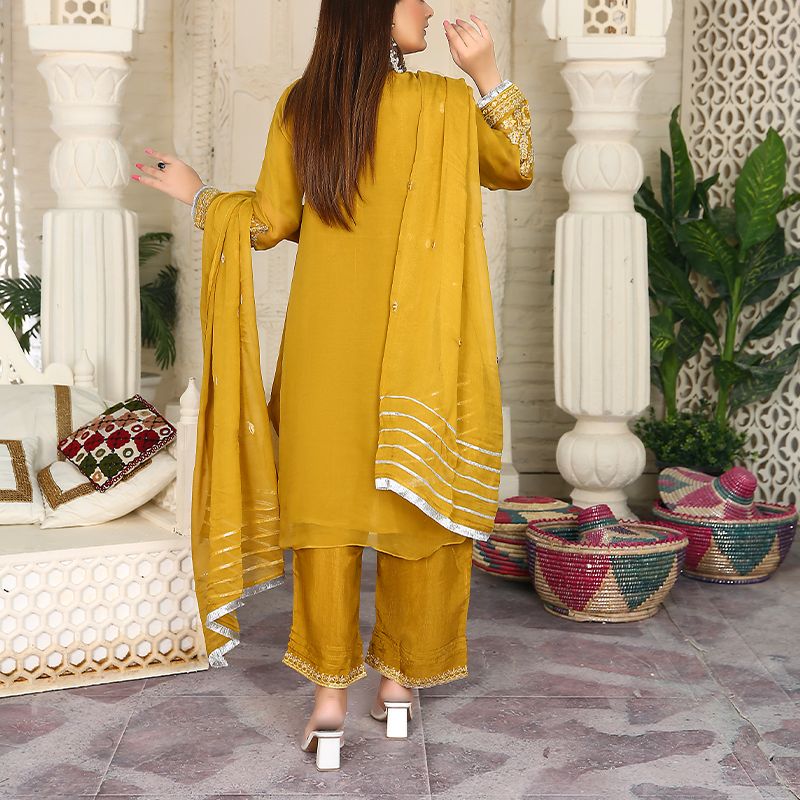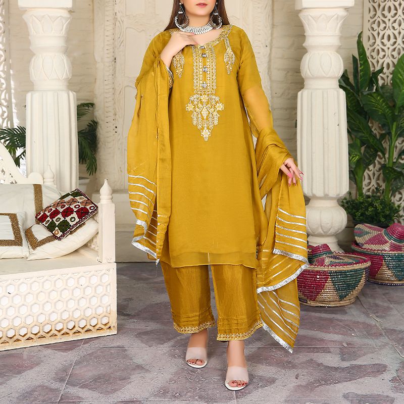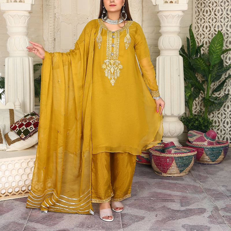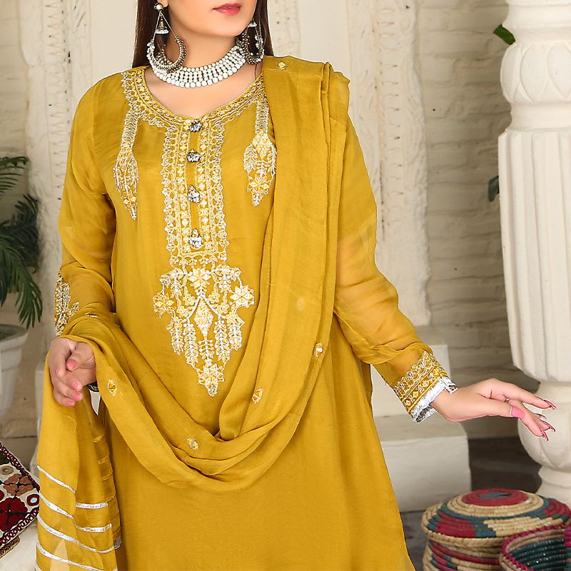3 Piece Fancy Embroidery Dress - Stylish Light Weight Chiffon Organza Fabric Suit Fancy Embroidered Dress For Events Party Outdoor Dress - Golden