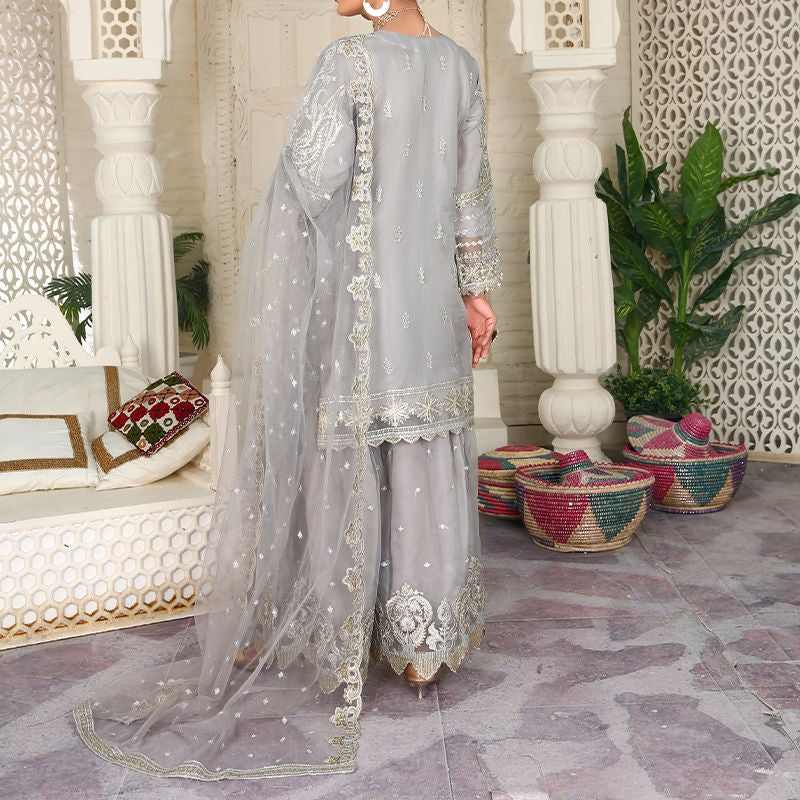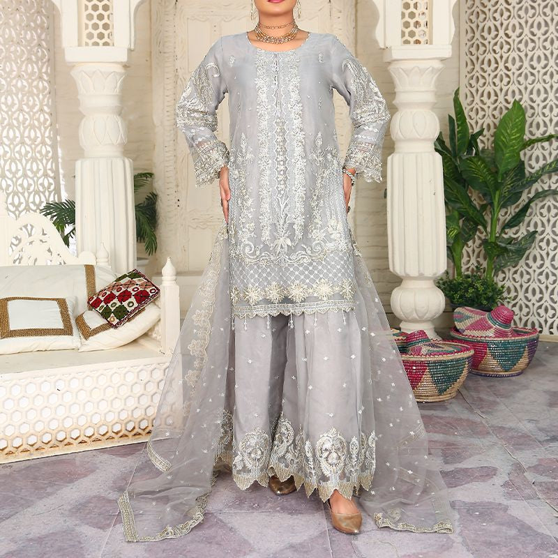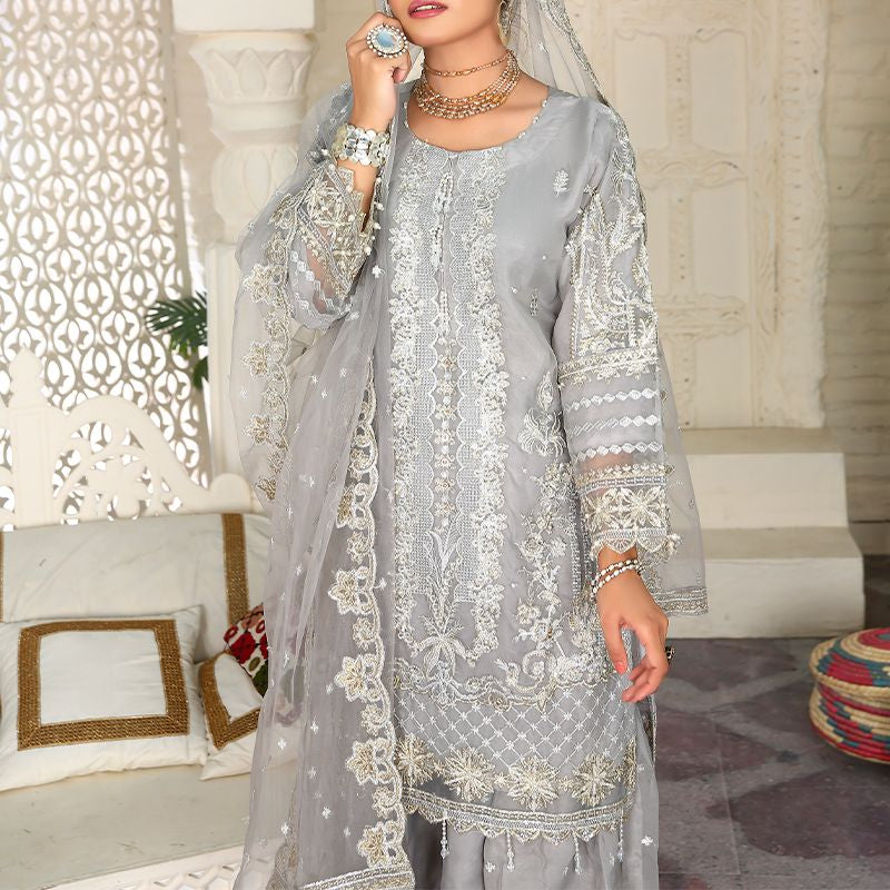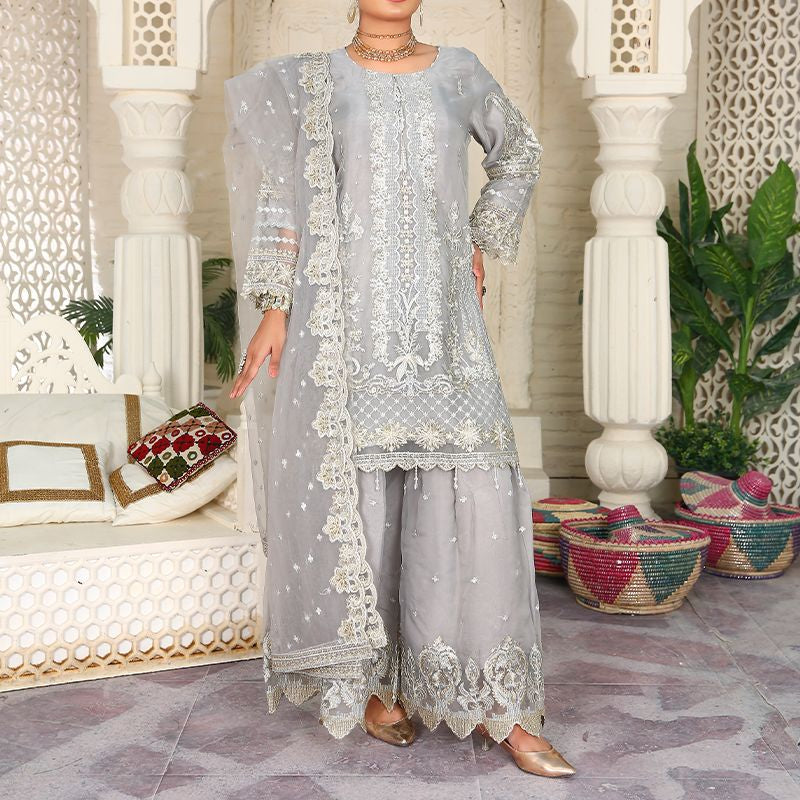 3 Piece Fancy Embroidery Dress - Stylish Light Weight Chiffon Organza Fabric Suit Fancy Embroidered Dress For Events Party Outdoor Dress - Gray