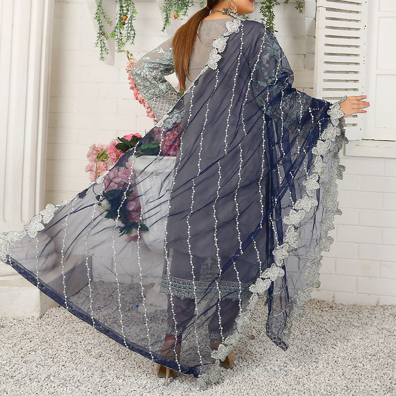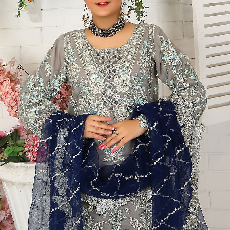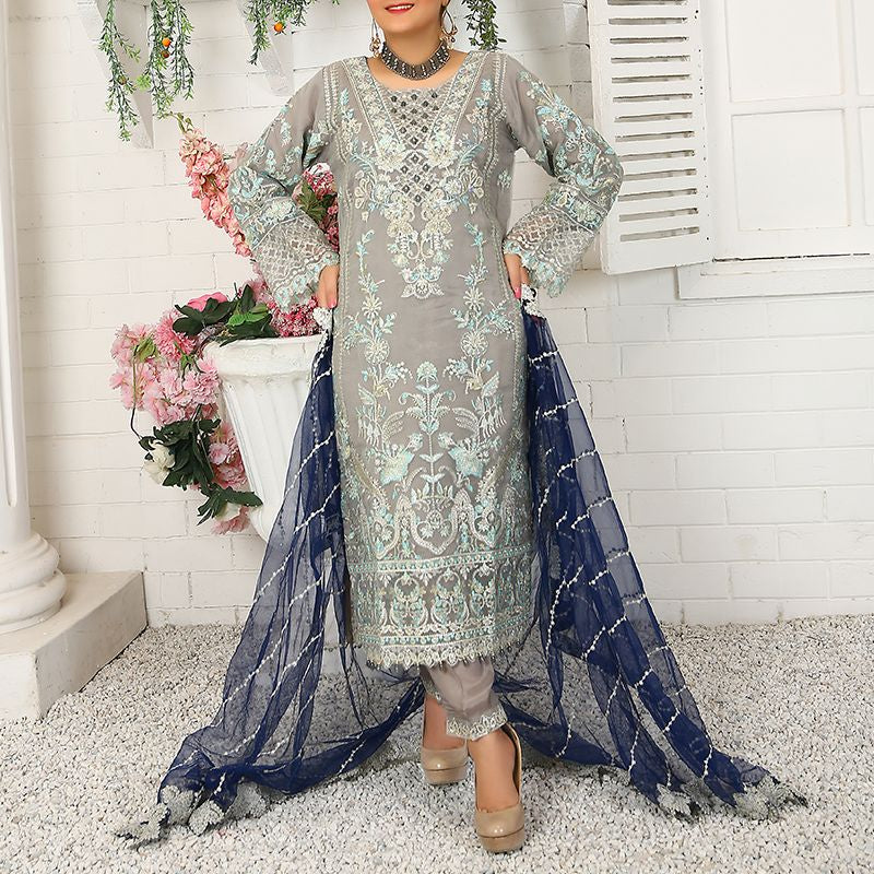 3 Piece Fancy Embroidery Dress - Stylish Light Weight Chiffon Organza Fabric Suit Fancy Embroidered Dress For Events Party Outdoor Dress - Gray