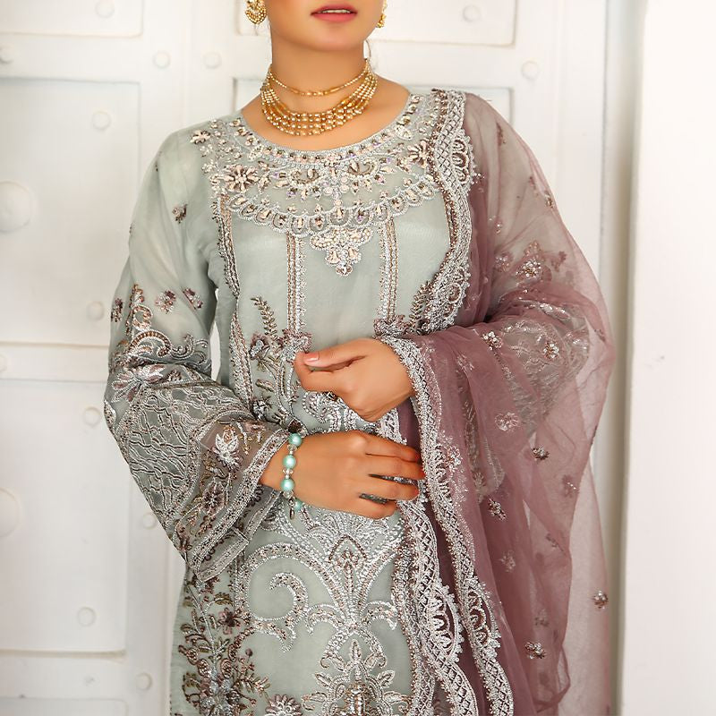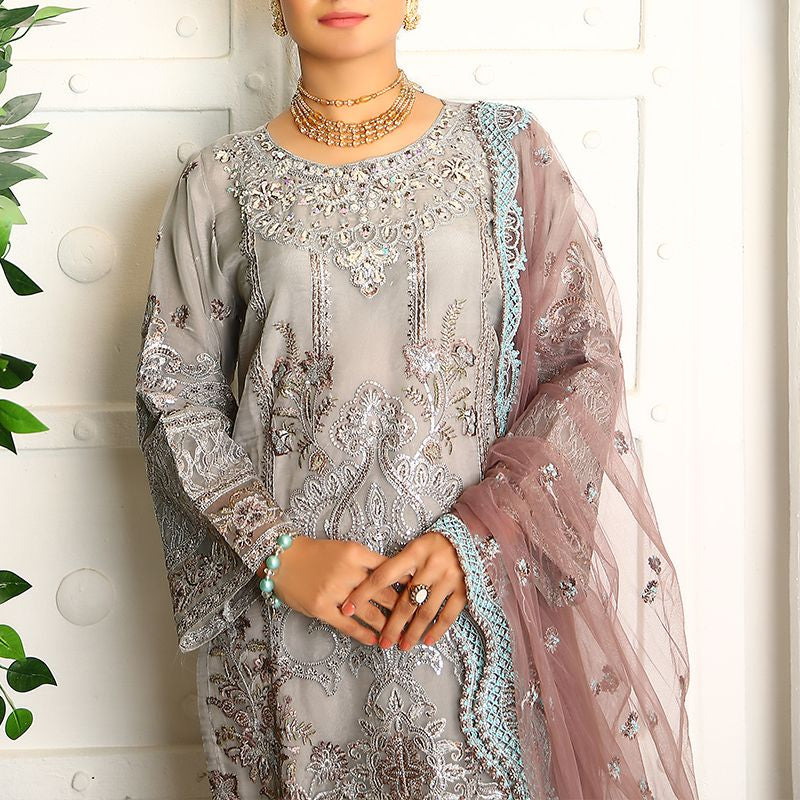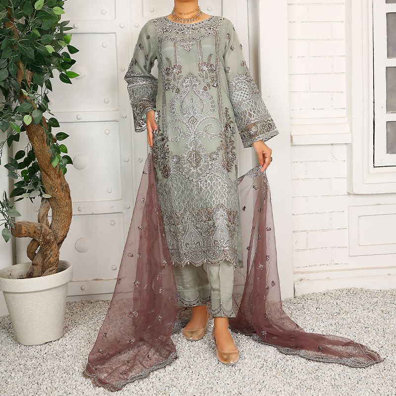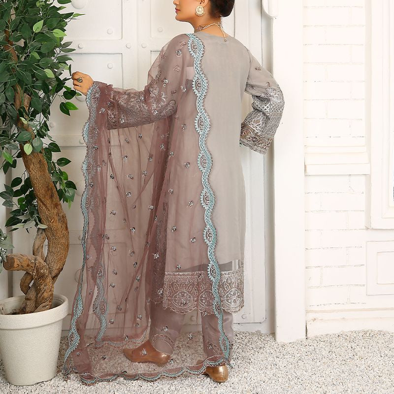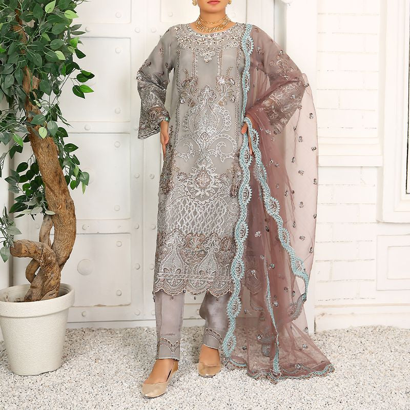 3 Piece Fancy Embroidery Dress - Stylish Light Weight Chiffon Organza Fabric Suit Fancy Embroidered Dress For Events Party Outdoor Dress - Gray