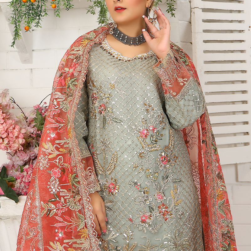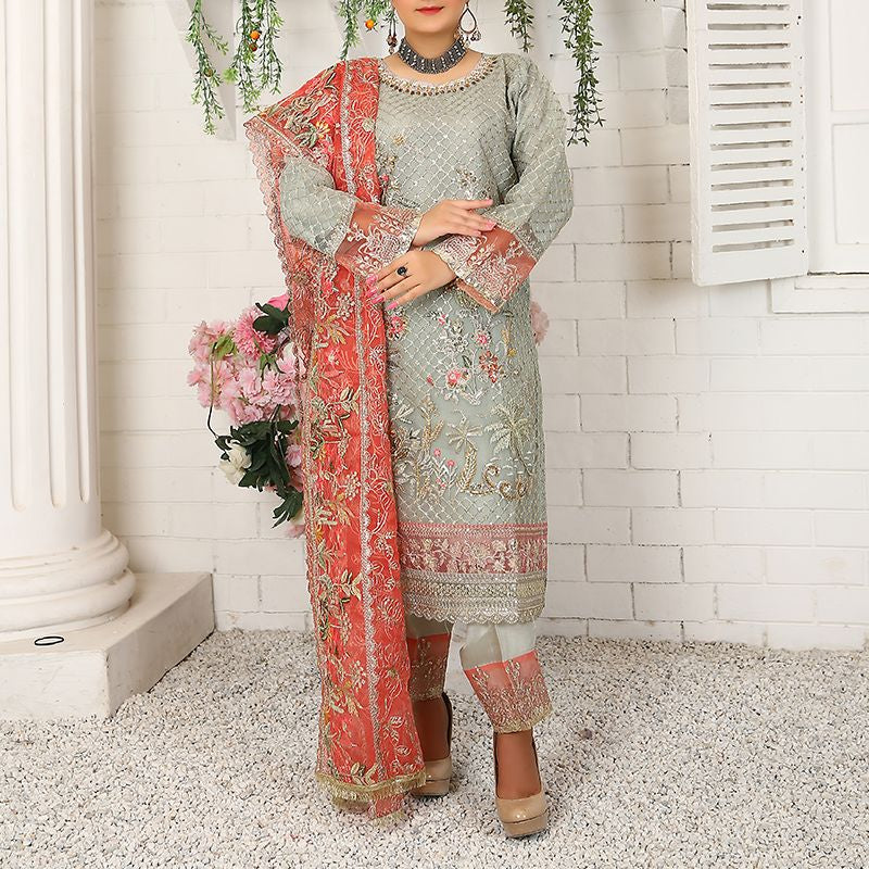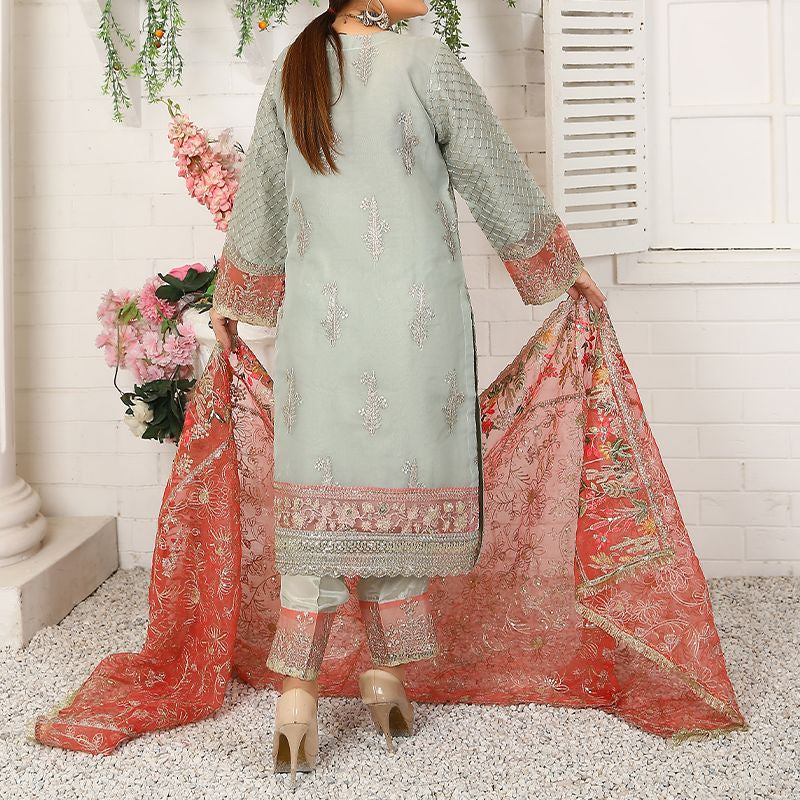 3 Piece Fancy Embroidery Dress - Stylish Light Weight Chiffon Organza Fabric Suit Fancy Embroidered Dress For Events Party Outdoor Dress - Green