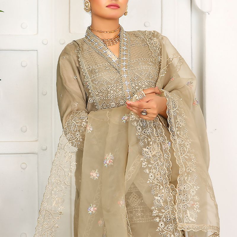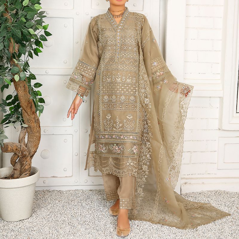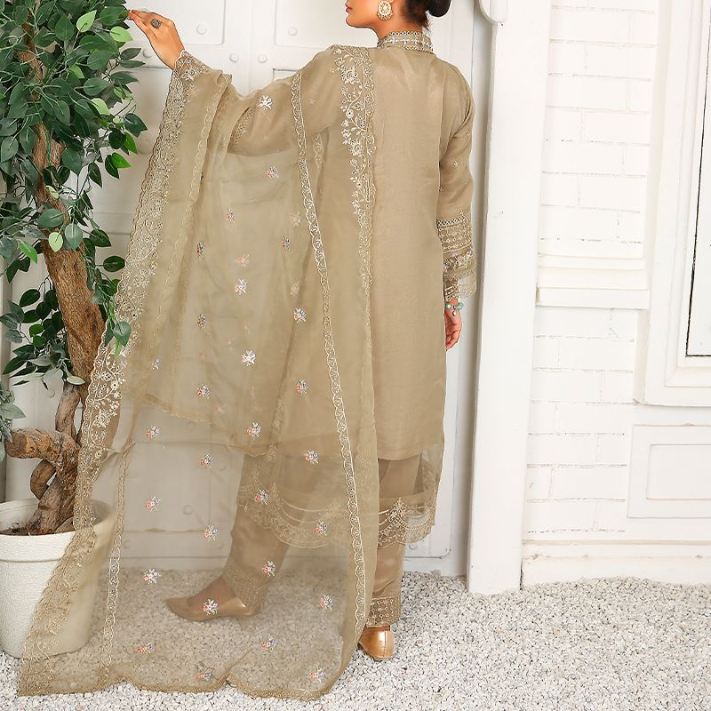 3 Piece Fancy Embroidery Dress - Stylish Light Weight Chiffon Organza Fabric Suit Fancy Embroidered Dress For Events Party Outdoor Dress - Khaki