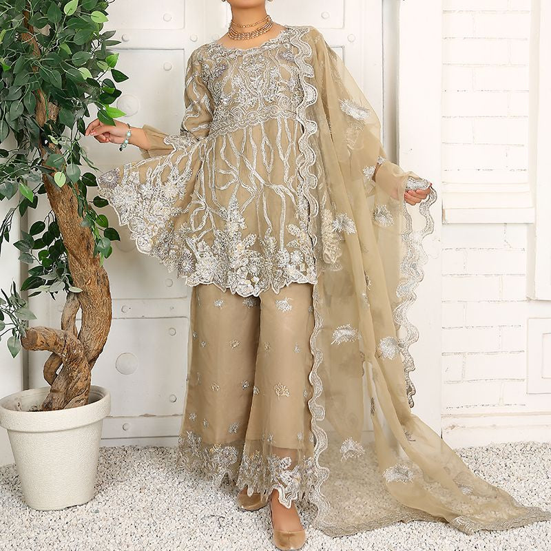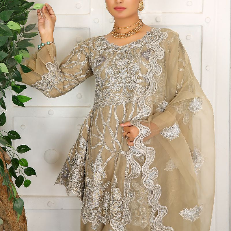 3 Piece Fancy Embroidery Dress - Stylish Light Weight Chiffon Organza Fabric Suit Fancy Embroidered Dress For Events Party Outdoor Dress - Khaki