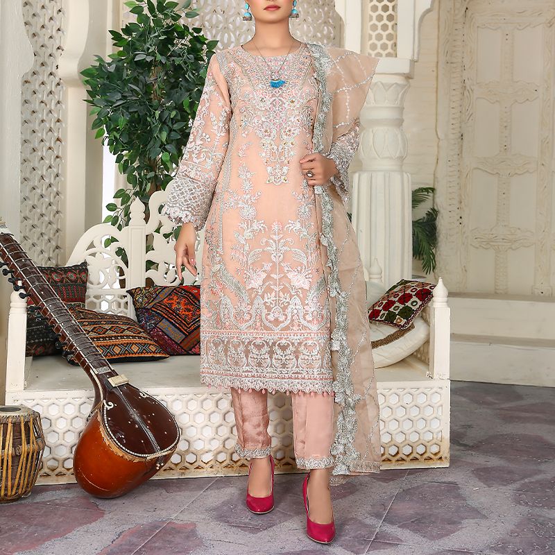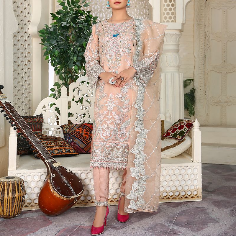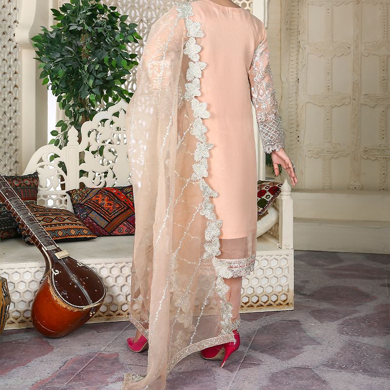 3 Piece Fancy Embroidery Dress - Stylish Light Weight Chiffon Organza Fabric Suit Fancy Embroidered Dress For Events Party Outdoor Dress - Light Pink