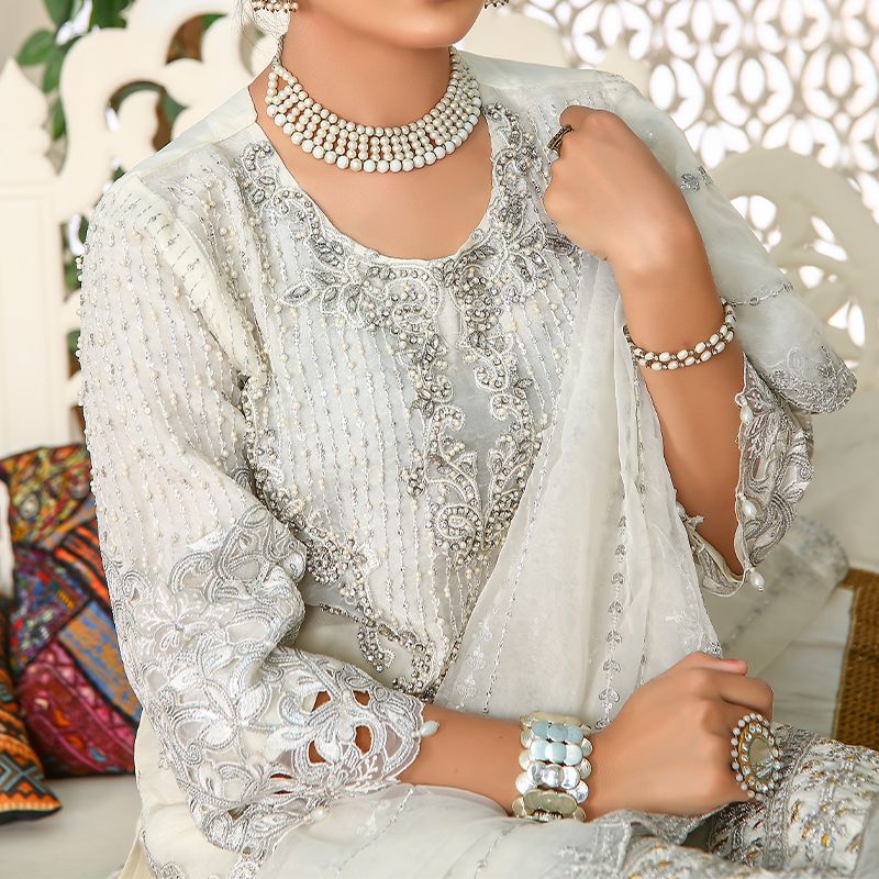 3 Piece Fancy Embroidery Dress - Stylish Light Weight Chiffon Organza Fabric Suit Fancy Embroidered Dress For Events Party Outdoor Dress - Offwhite