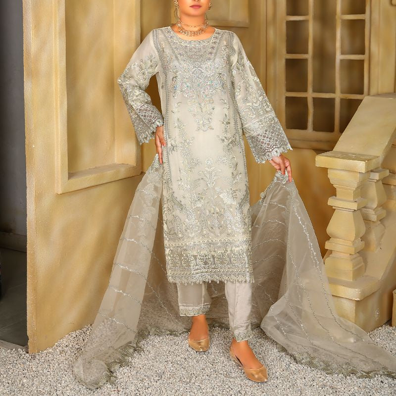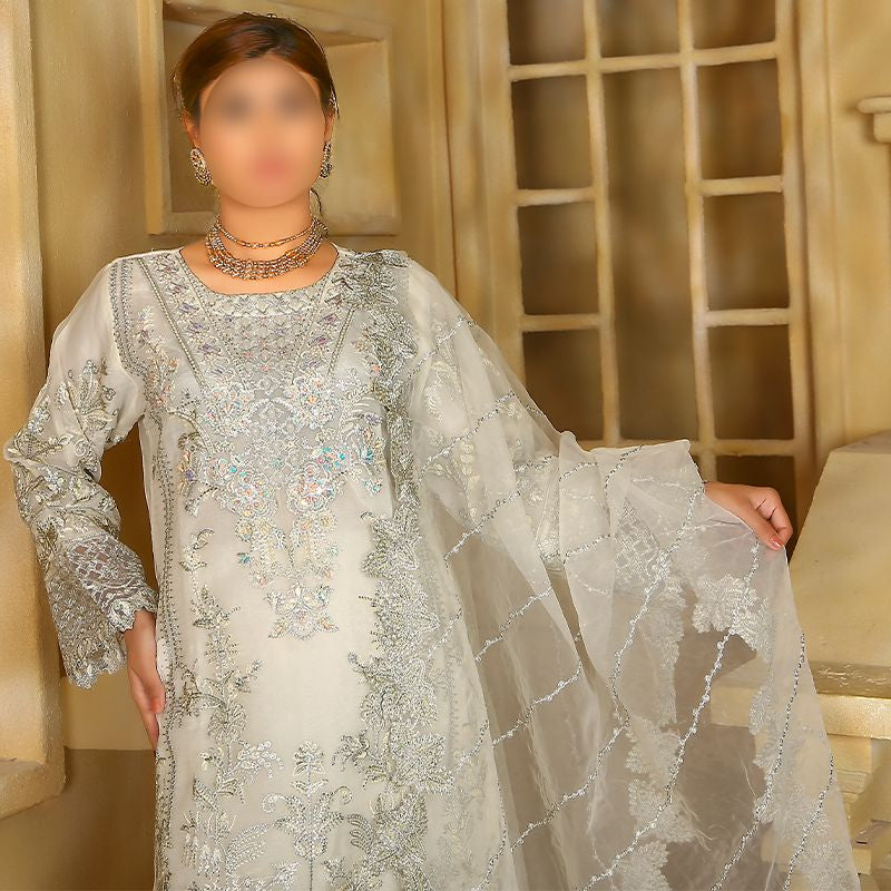 3 Piece Fancy Embroidery Dress - Stylish Light Weight Chiffon Organza Fabric Suit Fancy Embroidered Dress For Events Party Outdoor Dress - Offwhite
