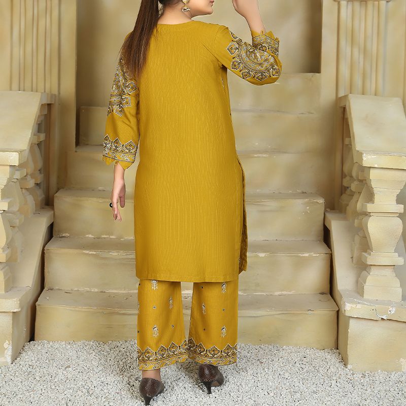2 Piece Kurti Salwar Embroidery Set - Pure Cotton Collection Stylish Solid Color Light Weight Cotton Fabric Suit Top Bottom Salwar Kameez Embroidered Suit For Event Party Outdoor Dress - Golden