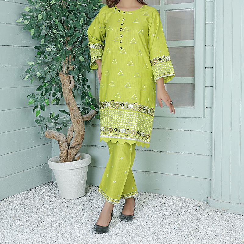 2 Piece Kurti Salwar Embroidery Set - Pure Cotton Collection Stylish Solid Color Light Weight Cotton Fabric Suit Top Bottom Salwar Kameez Embroidered Suit For Event Party Outdoor Dress - Green