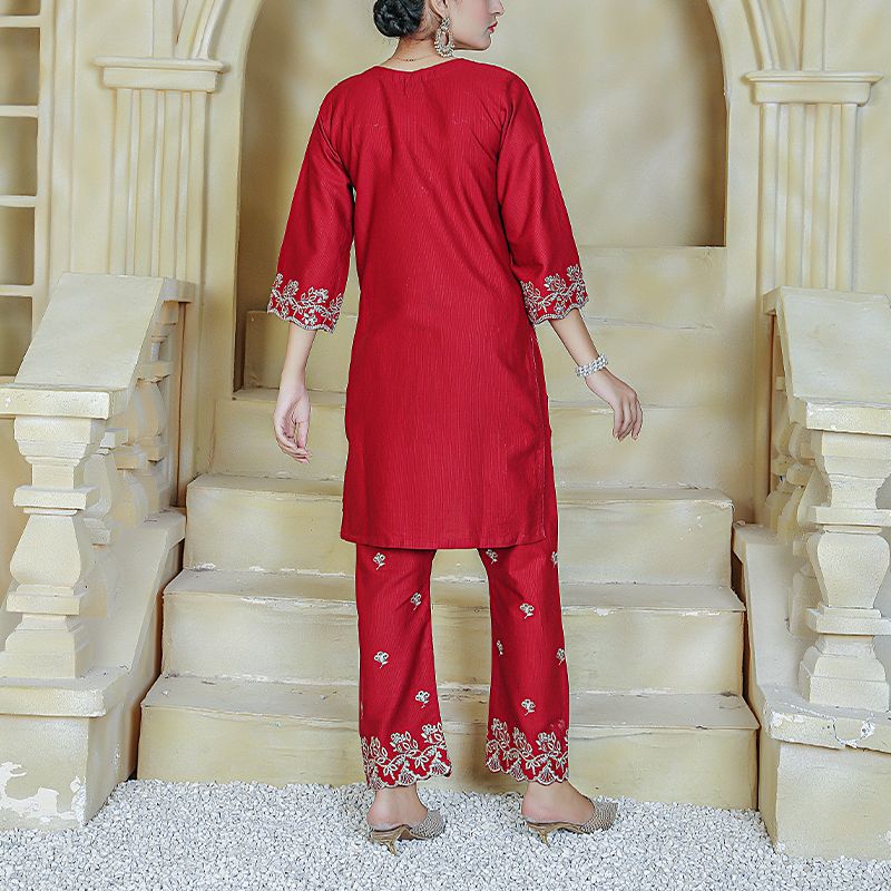 2 Piece Kurti Salwar Embroidery Set - Pure Cotton Collection Stylish Solid Color Light Weight Cotton Fabric Suit Top Bottom Salwar Kameez Embroidered Suit For Event Party Outdoor Dress - Maroon
