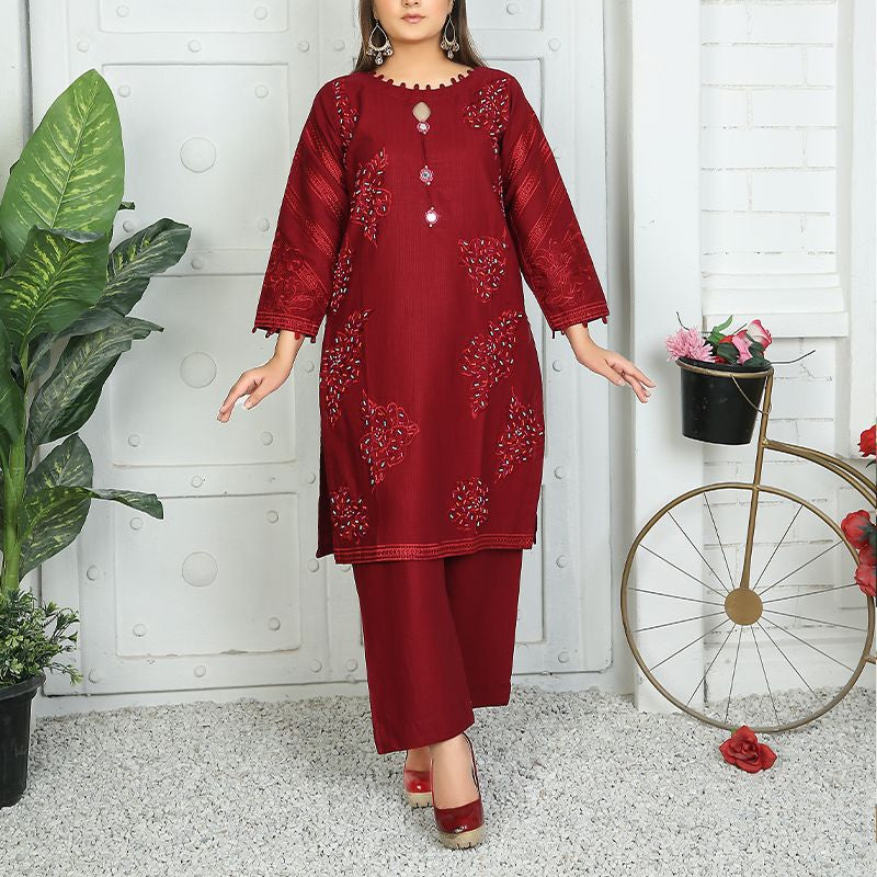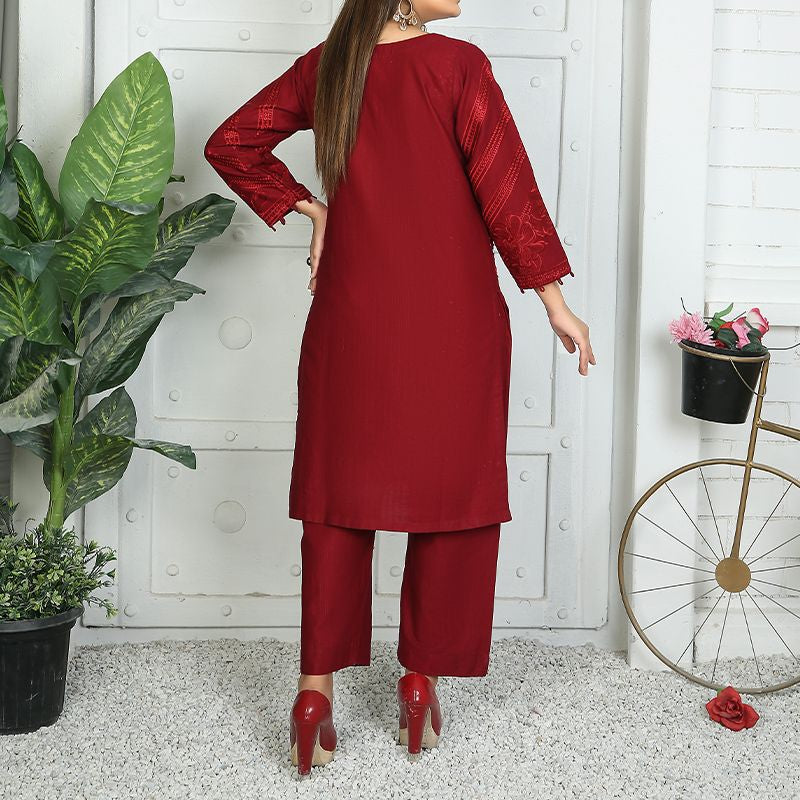 2 Piece Kurti Salwar Embroidery Set - Pure Cotton Collection Stylish Solid Color Light Weight Cotton Fabric Suit Top Bottom Salwar Kameez Embroidered Suit For Event Party Outdoor Dress - Maroon