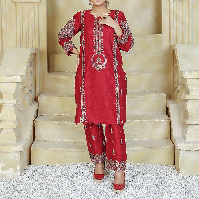 2 Piece Kurti Salwar Embroidery Set - Pure Cotton Collection Stylish Solid Color Light Weight Cotton Fabric Suit Top Bottom Salwar Kameez Embroidered Suit For Event Party Outdoor Dress - Maroon